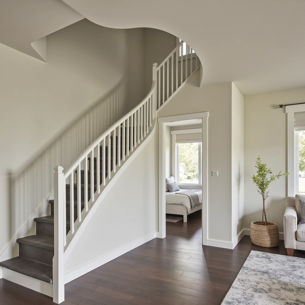Why choose a curved staircase? A curved staircase adds a touch of elegance and sophistication to your farmhouse. This design features a staircase that curves around a corner, creating a unique and eye-catching look. It’s perfect for traditional and classic farmhouse styles.
